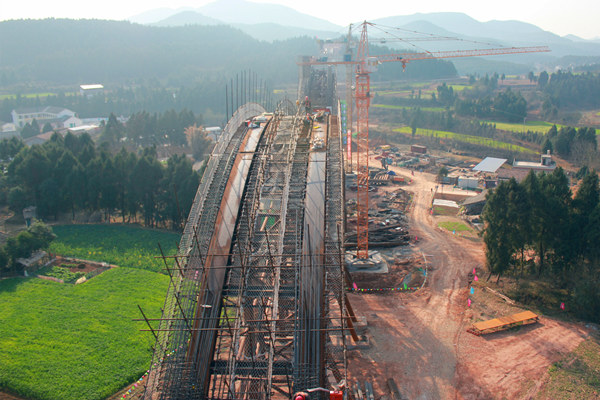 武引二期西梓干渠7标段二洞桥渡位于梓潼县二洞乡,横跨二洞河,全长518.5米,设计流量为24立方米每秒,沟谷段布置为5连拱拱式渡槽结构,拱跨为80m,拱高20m。图为1#拱圈与2#拱圈正在施工中。