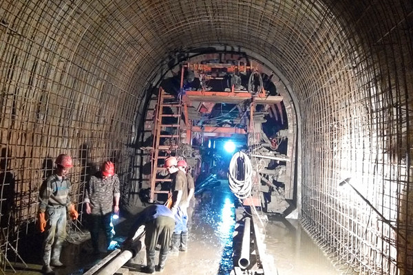 武引二期西梓干渠5标刘家山隧洞开挖、一次支护及底板砼浇筑完毕,正在进行边顶拱砼浇筑。